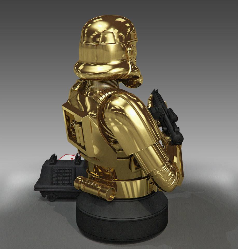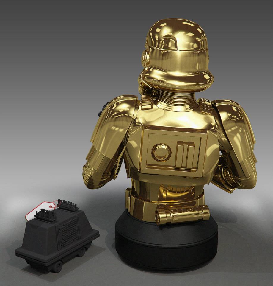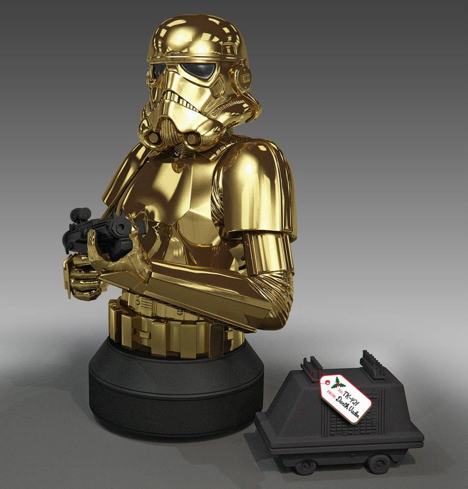 Gentle Giant has released new photos showing off the super shininess of their 10 Year Commemorative Golden Stormtrooper Holiday Bust. This "10 Year Commemorative Holiday Bust" celebrates the creation of the PGM program, which launched in 2004 with a Chrome and Gold Sandtrooper bust. The new Golden Stormtrooper features a brilliant chrome finish and is accompanied by an exclusive mouse droid with holiday wrap. The bust is priced at $100 and is exclusive to PG members only.