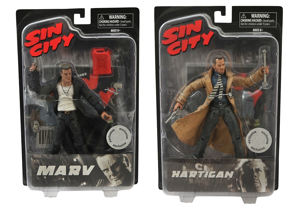 For those who prefer their neo-noir in living color, Marv (Mickey Rourke) and Hartigan (Bruce Willis) are now a pair of full-color action figures in Toys"R"Us stores. Packaged in more streamlined packaging, with smaller street bases, Marv and Hartigan each include their unique accessories and the same high level of articulation. Both the black-and-white Select figures and color Toys"R"Us figures were sculpted by Jean St. Jean.