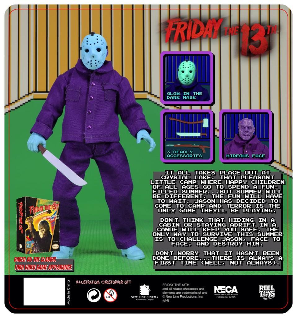 NECA is taking two of their newest figure formats and mashing them up for a new Toys"R"Us exclusive. Presenting the Mego-Style + Classic Video Game Appearance JASON VOORHEES. Using their popular 8" Mego-style figure body, NECA delivers a unique NES video game version of Jason as seen on their hit San Diego Comic-Con 2013 Exclusive Friday the 13th Jason (see HERE). The figure features a real cloth outfit, removable hockey mask and three weapons of camper destruction: axe, machete and speargun. This surprise figure is hitting Toys"R"Us stores now.