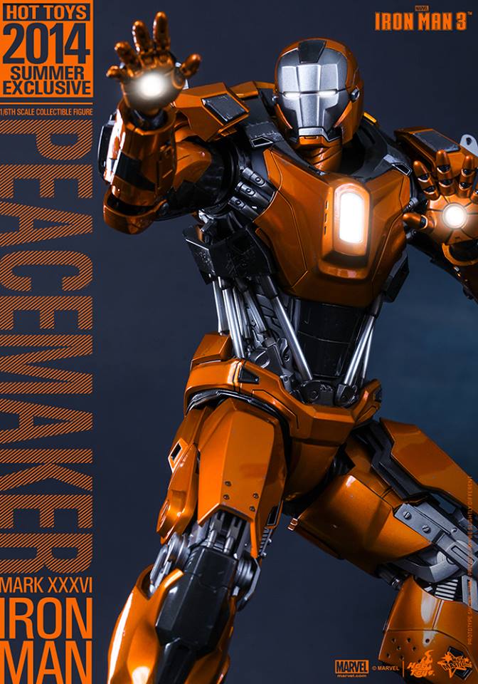 Peacemaker (Mark XXXVI) Collectible Figure as a 2014 Summer Exclusive item featuring special metallic orange, dark grey and silver painting with distress effect on armor, LED light-up functions, and figure base.
