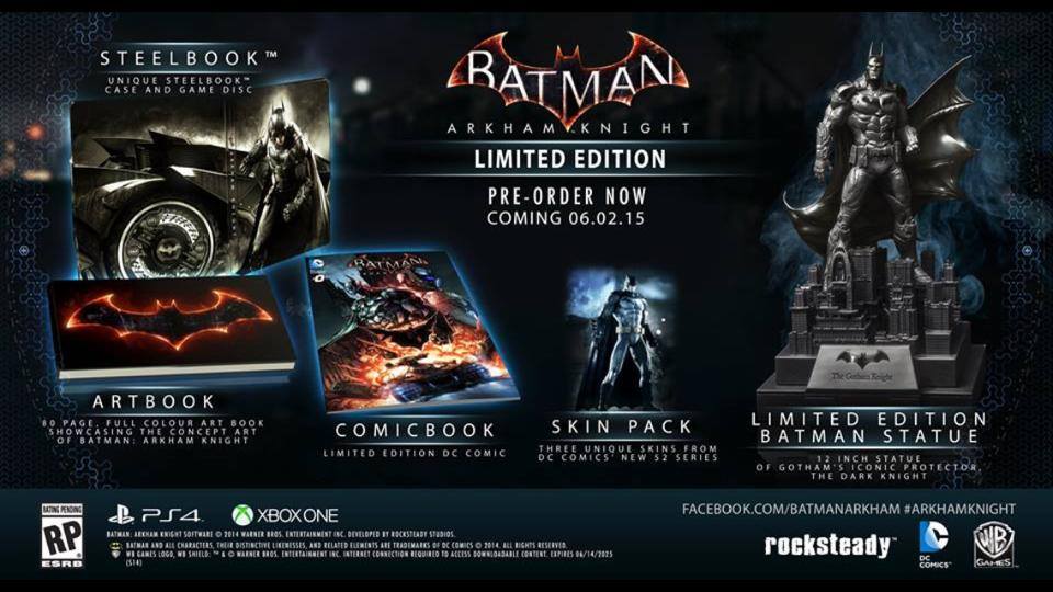 Batman: Arkham Knight, the the fourth main game in the "Batman: Arkham" series, now has a solid ship date of June 2, 2015. Originally planned for release next month, the delay allows Rocksteady to fine-tune the title and allow fans time to decide on which collector's edition to purchase. These include a Batman: Arkham Knight Limited Edition ($99 - pictured above) and the Batman: Arkham Knight Batmobile Edition ($199 - pictured below). Both bundles will include: