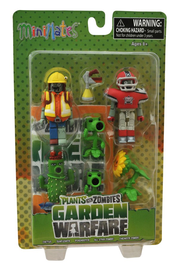 A Diamond Select Toys Release! The brand-new PvZ console game is now the craziest set of Minimates mini-figures ever! Two zombies and four plants from Plants vs. Zombies: Garden Warfare come together in this battle-ready six-pack, as the Cactus, Sunflower and two Pea Shooters take on the All-Star Zombie and Engineer Zombie. Each Zombie Minimate mini-figure is 2 inches tall with 14 points of articulation and features a variety of interchangeable parts and accessories. A Diamond Select Toys release. (Item #MAR141938, SRP: $19.99)