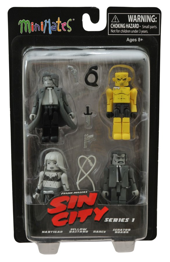 A Diamond Select Toys Release! The most dangerous city on Earth is now a far less dangerous line of Minimates mini-figures! The first assortment of black-and-white Minimates based on Robert Rodriguez and Frank Miller's hit movie Sin City includes four different mini-figures from "That Yellow Bastard": Hartigan, Nancy, Senator Roark and the Yellow Bastard himself. Each 2-inch mini-figure features a variety of interchangeable parts and accessories. (Item #MAR141948, SRP: $19.99)