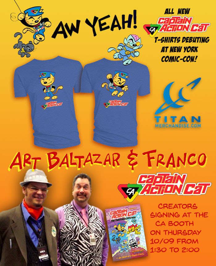 Lastly, Captain Action Ca t-shirts will be making their debut at New York Comic Con. Swing by the CA booth on Thursday (10-9) from 1:30pm to 2pm to meet the creators: Art Baltazar and Franco!