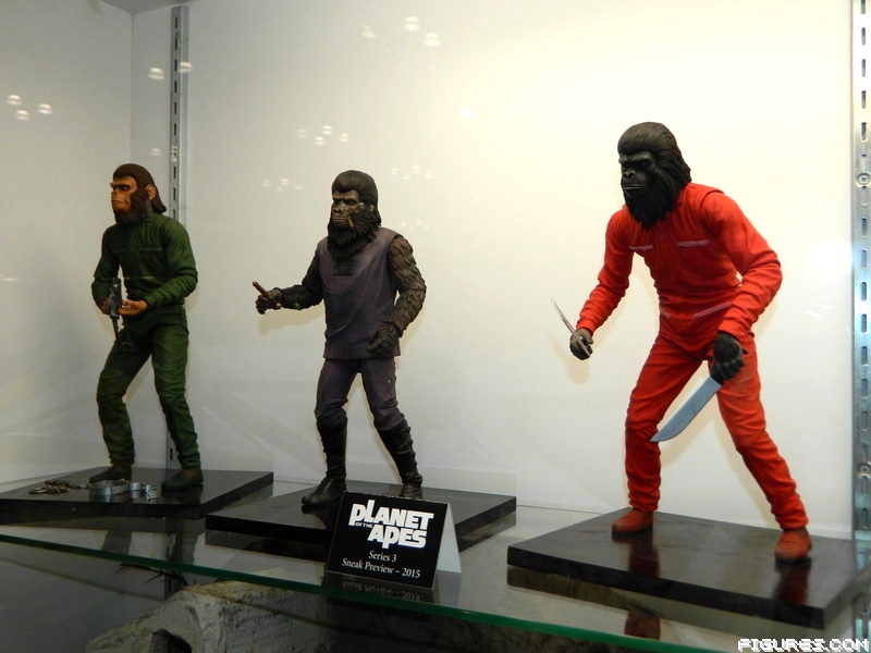 Planet of the Apes, both classic and new, continues to be a popular new license for NECA. For the former, NECA had on display their third assortment of Classic Apes set for release in early 2015. This wave will include Julius (with cigar), as well as two characters from "Conquest": Caesar (with machine gun) and a Gorilla (with cleaver and knife).