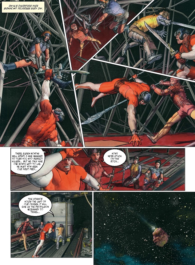I've never enjoyed sci-fi comics as much as I do when written by Jodorowsky and, while this new Metabarons tale isn't on the same level as the original series, it's better than 95% of the other sci-fi stuff out there. Let's not forget the brilliant artwork by Das Pastoras either. While it starts off a bit stiff and posed, Pastoras' line work improves drastically once the battles commence and, as the story progresses, the character artwork begins to seem reminiscent of Juan Giménez, the original Metabarons series' artist. Pastoras keeps the artwork both technically sound as well captivating; especially in larger, full-page and multi-panel scenes (above) and does an excellent job - especially later on - in developing unique character designs.