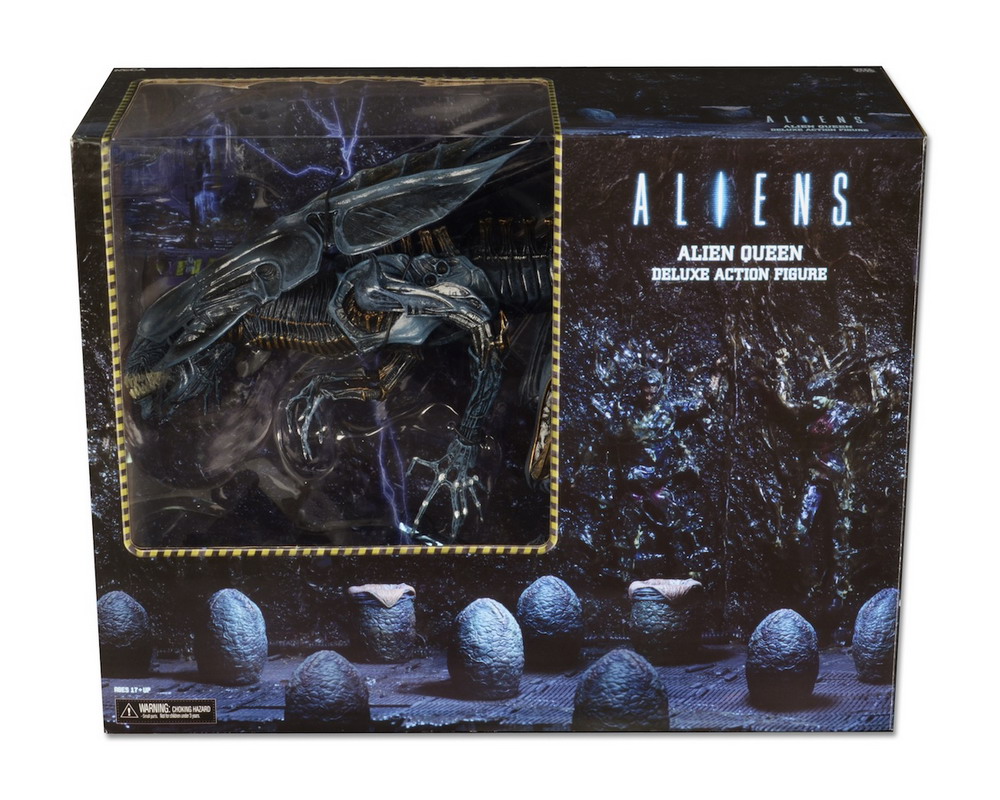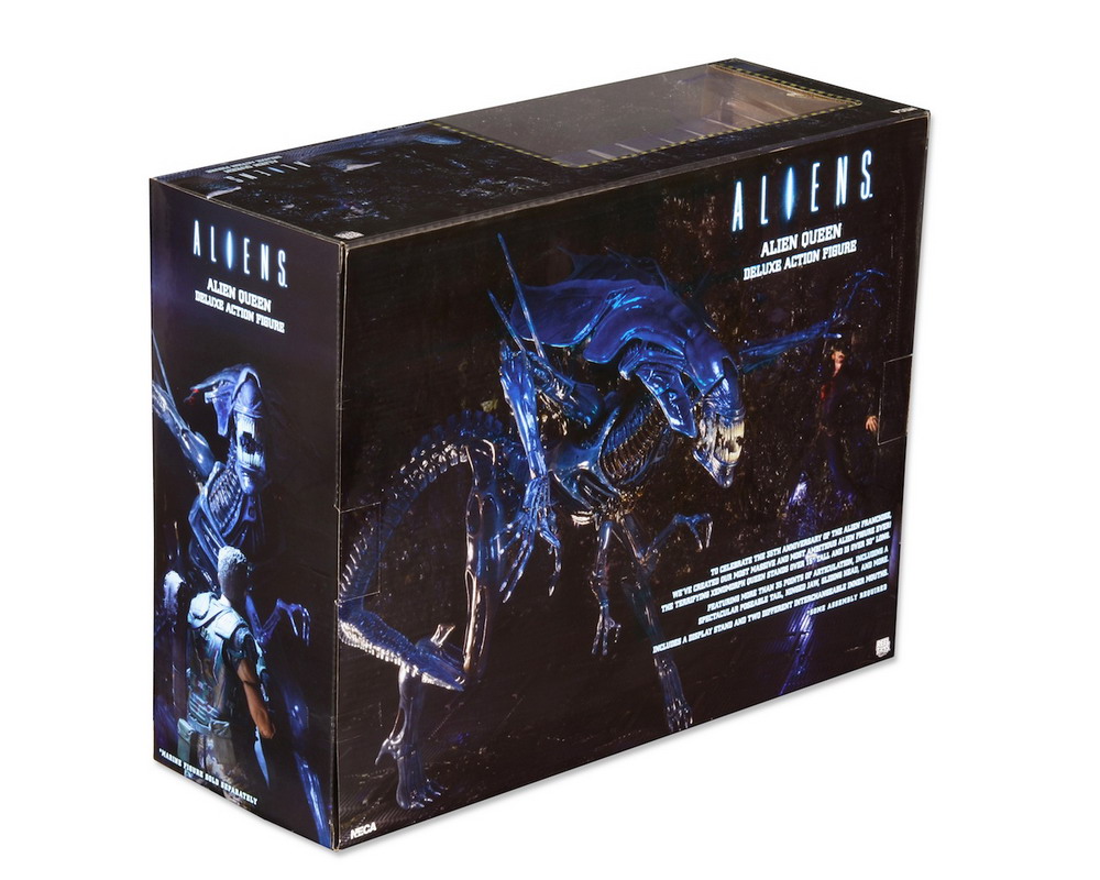 NECA has released new photos revealing the packaging for their upcoming deluxe Alien Queen action figure. Standing over 15″ tall and over 30″ long, the Alien Queen features over 30 points of articulation, including a poseable tail. The figure is priced at around $100 and is scheduled to arrive in stores next month.