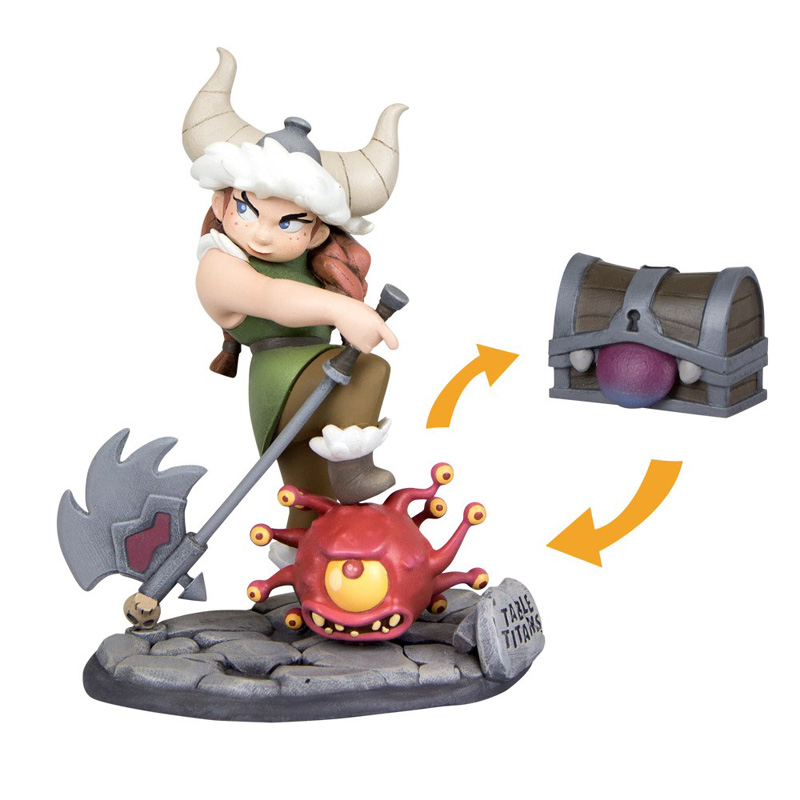 Expanding out from its hit line of My Little Pony: Friendship Is Magic figures, WeLoveFine is starting up a new series of cool vinyl figures with a distinctive fantasy flair. Scott Kurtz' iconic webcomic meets the original and biggest RPG ever in the Table Titans X Dungeons & Dragons lineup, starting now with Val & Beholder! Available for preorder, Val (standing approximately 5 inches tall) is captured in her full barbarian get up including green outfit, skull logo belt, horned helmet, twin braids, and of course her trusty axe. She's captured in a fun pose, looking back slyly as she rests one foot on a defeated foe... a chibi version of the iconic beholder! The rocky terrain base also features a Table Titans logo carving. And, as a special bonus people who preorder in the first wave will get an additional mimic figure that can be swapped out for the beholder or displayed separately! Scroll down for lots more images of Val & Beholder and check out the beautiful barbarian and her beaten beholder at WeLove Fine here: www.welovefine.com/8898-val-beholder-vinyl-pre-purchase.html