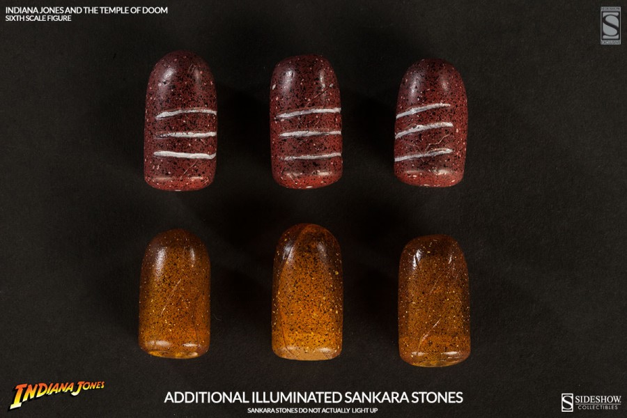 Bruised but not beaten, the rugged hero comes with everything he needs to recover the stolen Sankara Stones, put a stop to the sinister Mola Ram, win the girl, and save the day. The Sideshow Exclusive Edition will include additional ‘illuminated’ Sankara Stones (shown above).