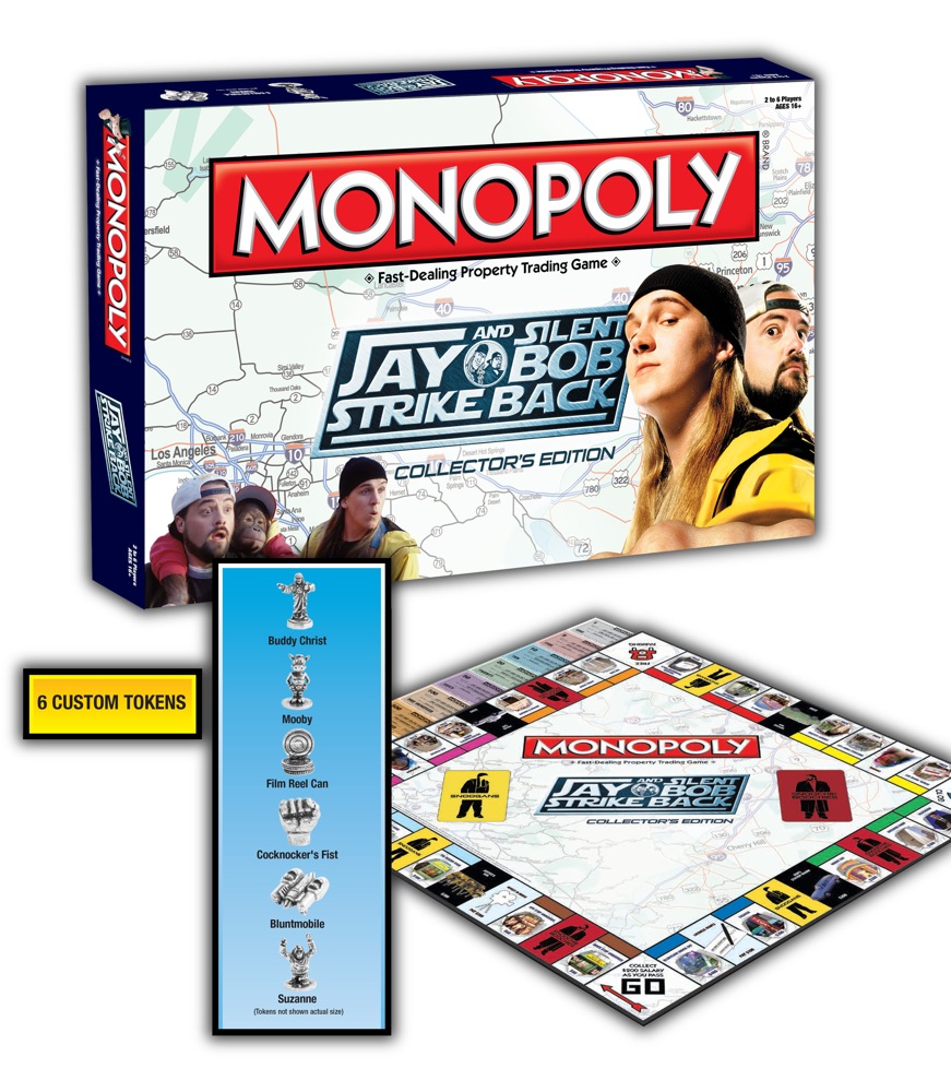Bring the magic of the movies home with the first board game ever based on the films of Kevin Smith! The cross-country adventure of "Jay and Silent Bob Strike Back" is now an official, authorized edition of Monopoly, with a game board featuring art and locations from the movie! The game also has new Chance cards, Community Chest cards and game pieces, all set to the same classic Monopoly gameplay! Packaged in a full-color game box with movie artwork. (Item #DEC142209, SRP: $39.99)
