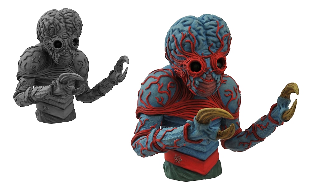 The Universal Monsters are not dead yet! This year, Halloween will bring one more vinyl bust bank to join the monstrous line-up, the Metaluna Mutant! Whether you love him from This Island Earth or the Mystery Science Theatre 3000 takedown, he'll make a big impression on your shelf, with high-quality sculpting and paint details. Plus, his brain alone will hold several dollars in change, thanks to the coin slot on his back! Packaged in a clear polybag. (Item #JUL142037, SRP: $22.99)
