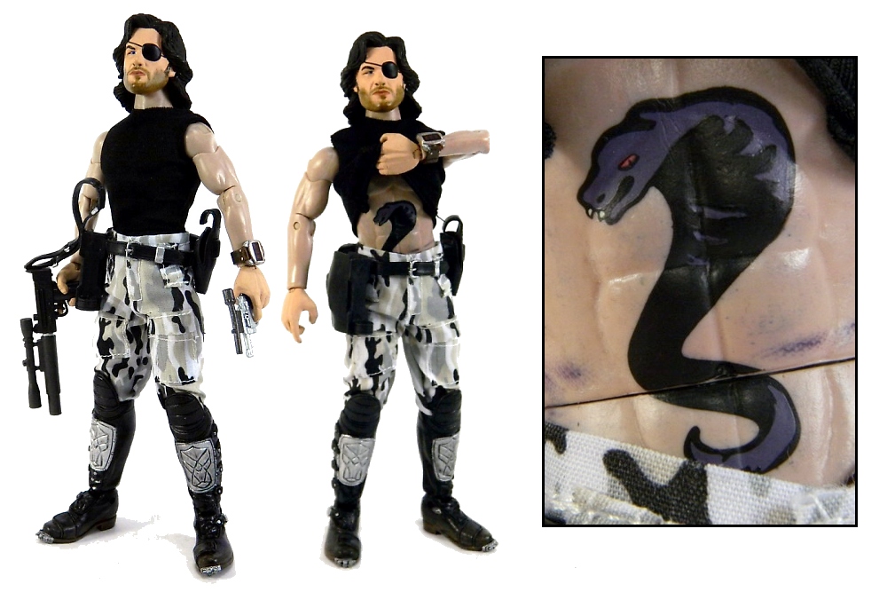 Out of pack, Snake Plissken screams Eighties action hero. The feathered hair, muscle shirt and camo pants hitched up above the waist are clearly fashion statements of the time, but the whole ensemble still works oh so well. I think the eye patch and worn leather jacket really help tie things together. All kidding aside, this is the Snake I know and love and NECA hit it outta the park with his screen-accurate presentation. Want Snake as he appears in the second half of the movie? No problem, simply pop off his hands and slide off his bomber jacket so that Snake Plissken can flex his muscles. Heck, if you want to achieve Snake's look in the battle arena, you can go one step further by taking off his tee to expose his awesome cobra chest tattoo! My figure had a bit of paint rub (or perhaps its dye from his black shirt), but I admire NECA going all out on the detail. Plus, while I love both of those Snake Plissken looks, when I get a fully kitted-out figure like this, I feel the need to display it that way. Having my Snake Plissken displayed half naked next to a pile of his clothes just strikes me as kinda... odd. Still, the option is there and you have to hand it to NECA for the fantastic fan-service.