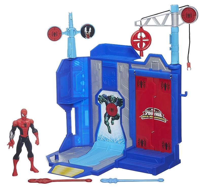 Now kids can join the Web Warriors in web-launching action with the Trickshot Showdown playset! This web-blasting arena includes a 6-inch scale Spider-Man figure, 2 stretchy webs, and 5 targets to blast! The Spider-Man figure can attach to the spinning crane and go crashing through the doors to attack the villains. Targets include a spinning Venom and collapsing Green Goblin.