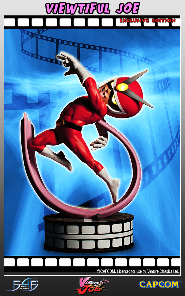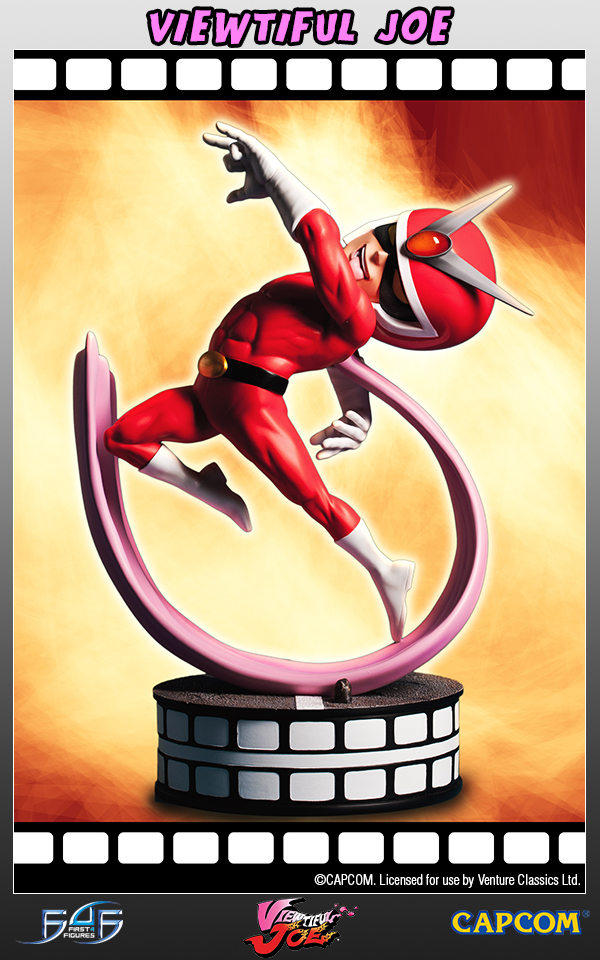 Viewtiful Joe is portrayed with the same comical appearance as seen in the series. The 13.5 inch tall statue depicts Joe upon a detailed road surface in a dynamic pose, edged with a film-reel style design.