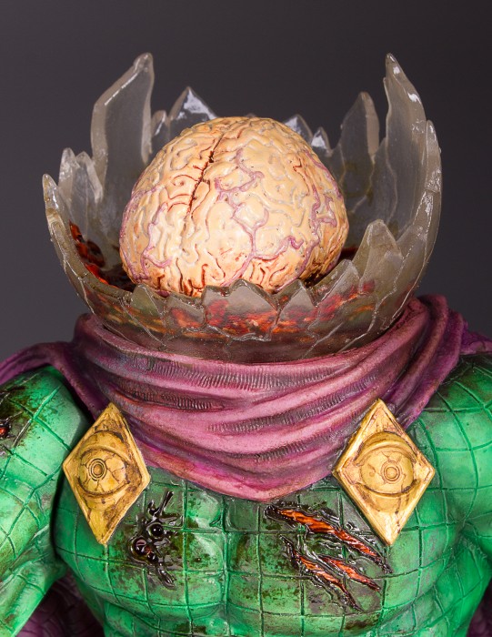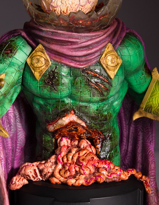Several characters have donned the Mysterio costume to plague Spider-Man in the character’s long history. None, however, have been as grotesque as the Mysterio that appeared in the Marvel Zombies Universe! Gentle Giant presents the Marvel Zombie Mysterio Mini Bust, featuring the zombified master of illusion with his greatest asset exposed, HIS BRAIN! With cracked dome, bloody grey matter, and entrails spilling out, this horrifying creature no longer needs parlor tricks to frighten his foes. Crafted using only the highest quality polystone, each limited-edition, hand-painted mini bust comes individually numbered and is packed with a matching certificate of authenticity.