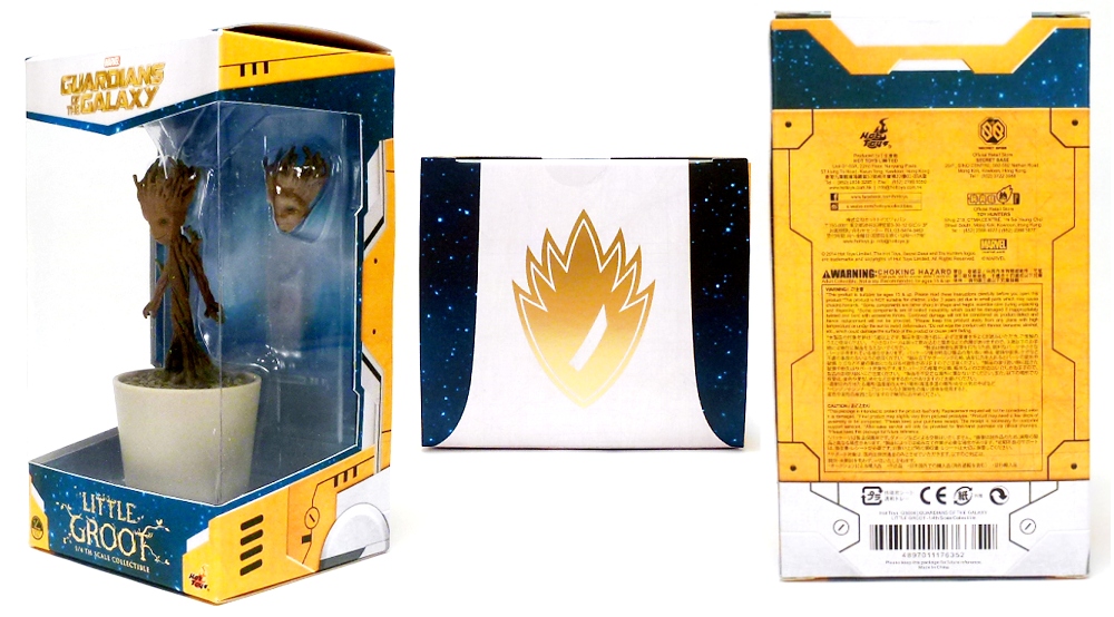 Little Groot comes in a really nice package, a small window box showing off the adorable figure and its accessories.  The overall theme of the box is blue and yellow with technological details reminiscent of a spaceship.  On the front panel above the window is the Guardians of the Galaxy movie title logo, and below is the name of the figure (“Little Groot”), the Hot Toys logo, and a ¼/quarter scale emblem.  Both sides of the box feature the wraparound window and cool graphics, and the top has the gold Guardians of the Galaxy symbol.  The back panel is packed with tech info, warnings, more logos, and the like.  Getting your Groot out couldn’t be easier as the figure sits in a plastic tray along with the two accessories.