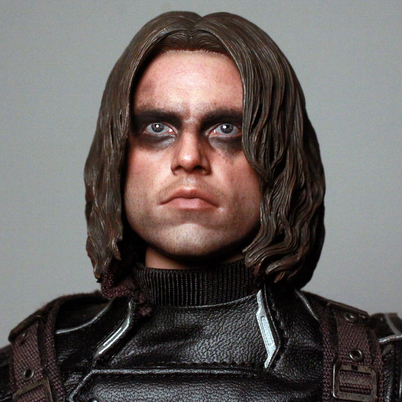Two portraits for The Winter Soldier and three possible looks. For starters, the unmasked head is how we see Bucky later in the film. The second portrait is Winter Soldier with a mask. A separate goggles piece plugs into the side of his face but before you do that you’ll remove his hair piece to do so. Connecting via magnet, the hair sits on his head tightly enough.