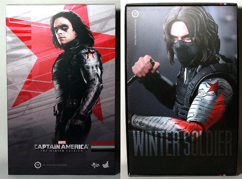 The packaging shows a production still of Sebastian Stan as The Winter Soldier, a large red Soviet star behind him and the crew of Hot Toys on the back. The box is sturdy, keeping contents safe for the most part. Inside is an insert sleeve with a photo of the Hot Toys Winter Soldier and below that, multi-layers of trays containing the figure, accessories, and display stand. There are no twist ties but there is tape and plastic wrapped around the hands and feet. Sometimes I’m lucky to pull them right off but sometimes they’re a real pain.