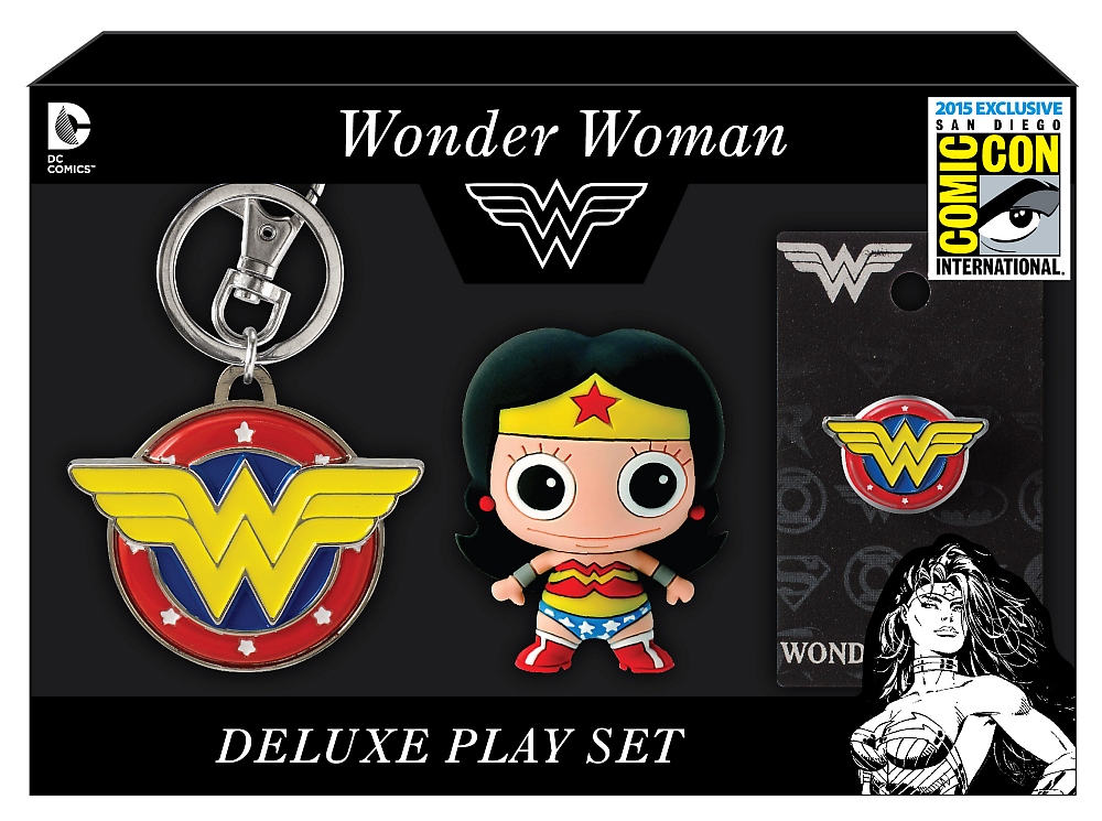 Monogram International pulls the curtain back on their first exclusive for this year's San Diego Comic-Con: the Deluxe 3-Piece Wonder Woman Set. Packing three times the fun, this super set includes a stylized 3D Wonder Woman foam figural keyring, a pewter lapel pin and a specially designed colored pewter keyring, an item not yet available in stores. Everything comes classically packaged in a black display box with exclusive SDCC'15 sticker, allowing you to let your inner power to shine through!
