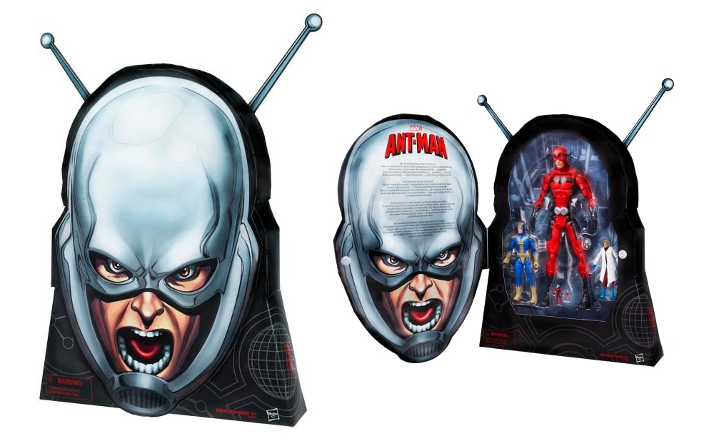 The second is a deluxe Ant-Man figure set packaged inside a cardboard helmet with a swiveling antennae. It includes a 12-inch Giant Man, 6-inch Goliath, 3.75-inch Hank Pym (who comes in a lab coat with swappable heads), 1.5-inch Scott Lang/Ant-Man, and 1-inch Hank Pym/Ant-Man. The set will retail for $64.99.