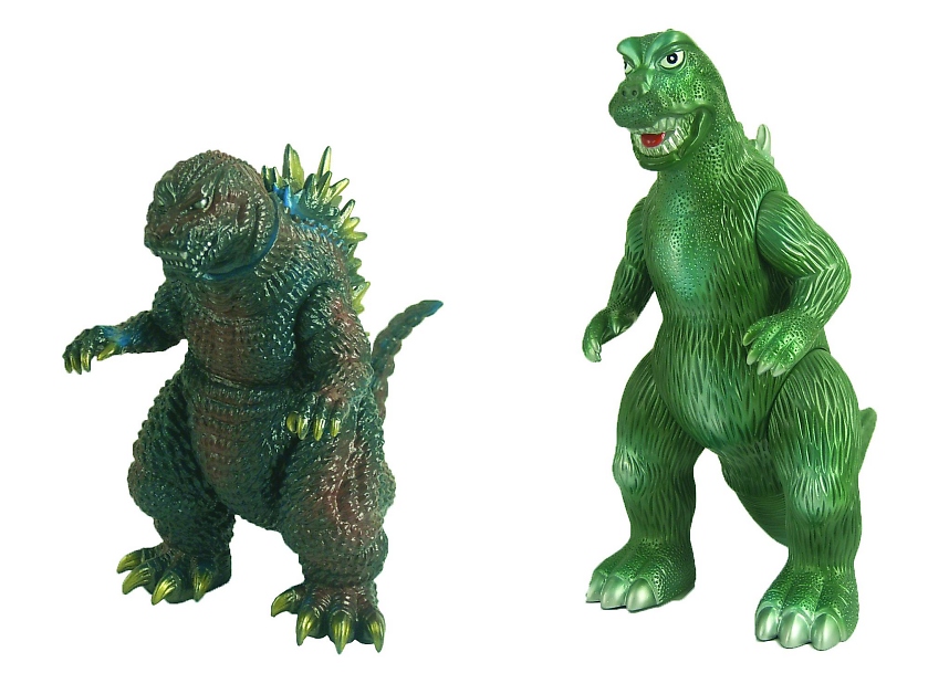 The bright green 1967 Sofubi is modeled after the kaiju depicted in Son of Godzilla, a film which helped bring Godzilla to younger audiences. The GMK Sofubi is a modern take on the character, styled after Godzilla's grittier, spikier appearance in the 2001 film Godzilla, Mothra and King Ghidorah: Giant Monsters All-Out Attack.