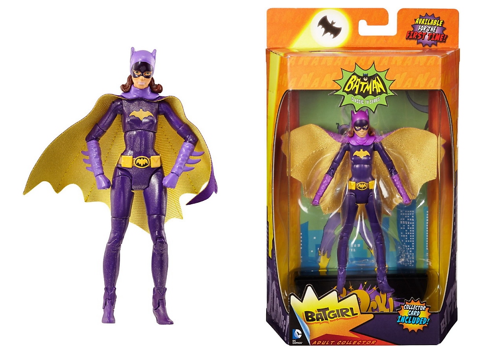 Brave and beautiful in 6-inch scale, and rendered in actress Yvonne Craig’s likeness, this classic TV series Batgirl features dynamic, iconic colors, a two-sided soft goods cape and 16 points of articulation for ultimate playtime action and posing. Collectors can display her on the included base and choose between one of two retro cityscape backdrops.