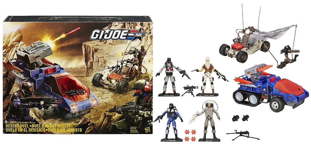 It’s a fast-firing, high-rolling G.I. JOE-Cobra battle with this DESERT DUEL pack. Complete with a Cobra Basilisk tank and an Elite Horseman figure to drive it, fans can load missiles in the elevating, rotating launcher, making the set’s Cobra Air Trooper figure a rolling nightmare for the G.I. JOE commandos. But with the included Philip “Chuckles” Provost figure, kids and collectors can fold out the camouflage canopy on the F.O.E. Striker 4-wheeler and take aim at enemies with the poseable cannon. And, if the pack’s Night Fox figure has to pursue enemies on foot, the cannon comes off the vehicle.