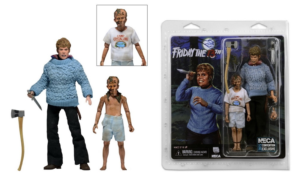 For the 35th anniversary of Friday the 13th, we have a double treat for fans! Our newest retro clothed action figures are the highly demanded Pamela Voorhees and her son, Jason. The original killer, Jason’s mom stands 8″ tall and is dressed in fabric clothing similar to the iconic toy lines of the 1970s. The figure features the authorized likeness of Betsy Palmer, is fully poseable and comes with knife and ax accessories. Young Jason stands 5.5″ tall and is dressed in a Camp Crystal Lake t-shirt and swim trunks. He comes with removable mud and debris from the lake. The packaging features custom artwork created by Jason Edmiston just for this release!