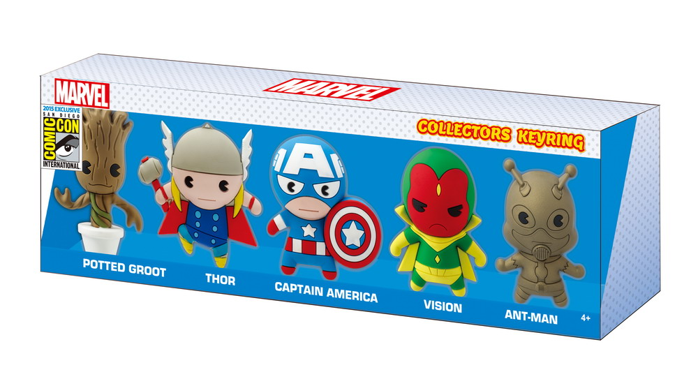 The great defenders of the galaxy and beyond make their way to Comic Con 2015! The exclusive 3D Foam Collector Key Ring set features beloved Marvel heroes, including Potted Groot, Thor, Captain America, Vision, and exclusive to this set, an all-new Gold Ant-Man 3D Foam Key Ring, a product not yet available in stores!