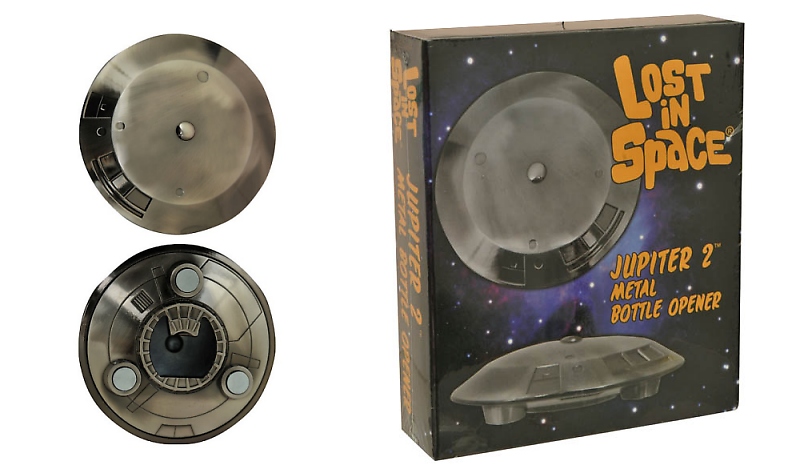 Travel to the farthest reaches of your refrigerator with this 3-inch metal bottle opener of the famous Jupiter 2 spaceship from Lost in Space! You won't need a helper robot to open your bottles anymore, and magnets on the underside will allow it to hover in place on your refrigerator door, or on the dashboard of your lunar rover. Packaged in a full-color slipcase. (Item #FEB152164, SRP: $18.00)