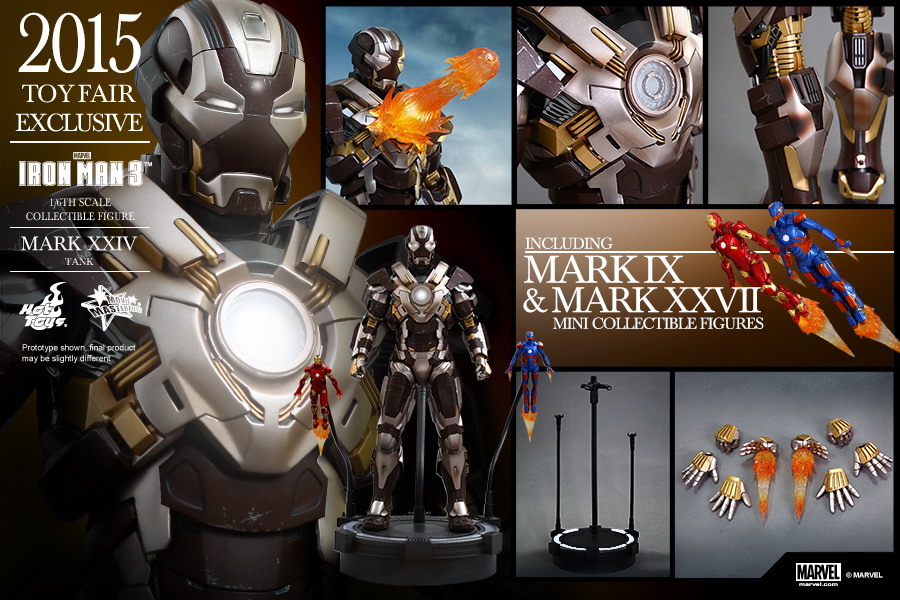 Iron Man 3: 1:6 Tank (Mark XXIV). It features metallic brown and gold-colored armor, Unibeam and thruster effects accessories, LED light-up functions, a dynamic figure stand, and Mark IX and Disco (Mark XXVII) mini collectible figures that are perfect for recreating the iconic Iron Man 3 poster where the House Party Protocol suits are flying into action.