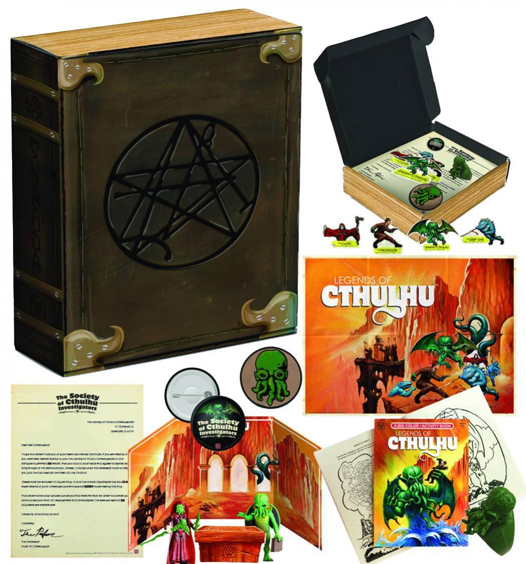 Also pictured is a better look at the new Necronomicon Collector Set (Item Code: AUG152446). Priced at $49.99, this nostalgic package includes background and altar playset standees, Legends of Cthulhu coloring/activity book, Cthulhu sew-on patch, Society of Cthulhu Investigators letter from “The Professor”, Society of Cthulhu Investigators pin, Society of Cthulhu Investigators ring, Legends of Cthulhu stickers, and a Legends of Cthulhu poster.