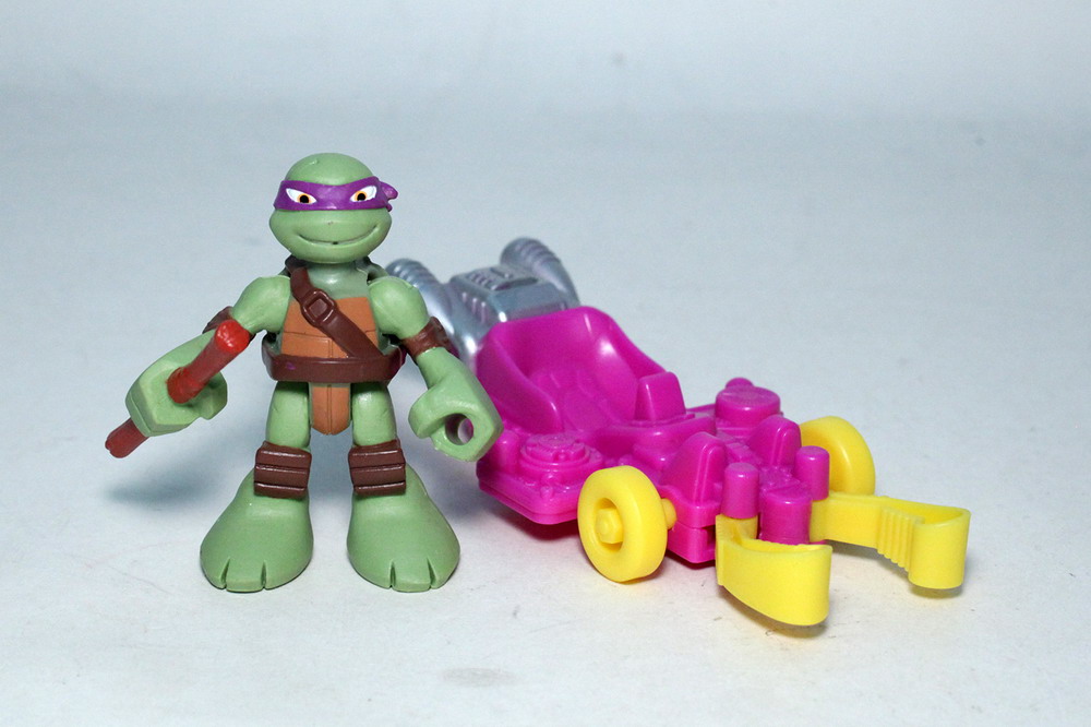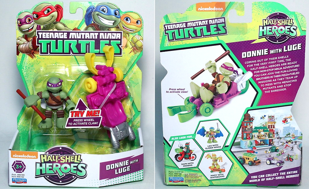 We’ll kick things off with Donnie with Luge (you can also get Leo with Glider Wings, Mikey with Skateboard, or Raph with Minibike), priced at about $8.99 retail. The sculpt is quite good, depicting a much younger looking turtle. The proportions of course are more child-like with large feet and hands. The paint is decent although with the way these are packaged, you might get some that have been lightly played with at the store already.