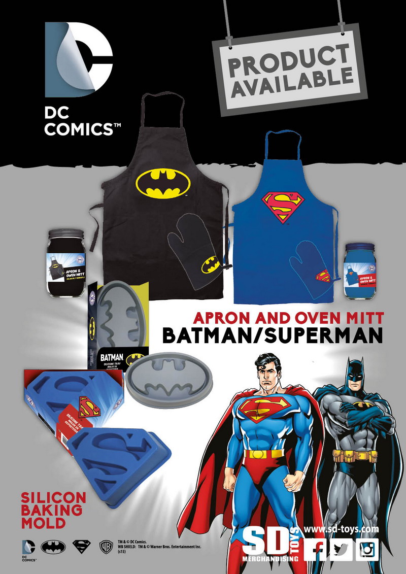 * DC COMICS - Other new products SD Toy sis selling like cookies these days are the new Batman and Superman aprons (w/oven mitt). They come in a glass jar so you can fill it with cookies later! (See what they did there?) Also available at their NYCC stand: Batman & Superman silicon baking molds for cakes!