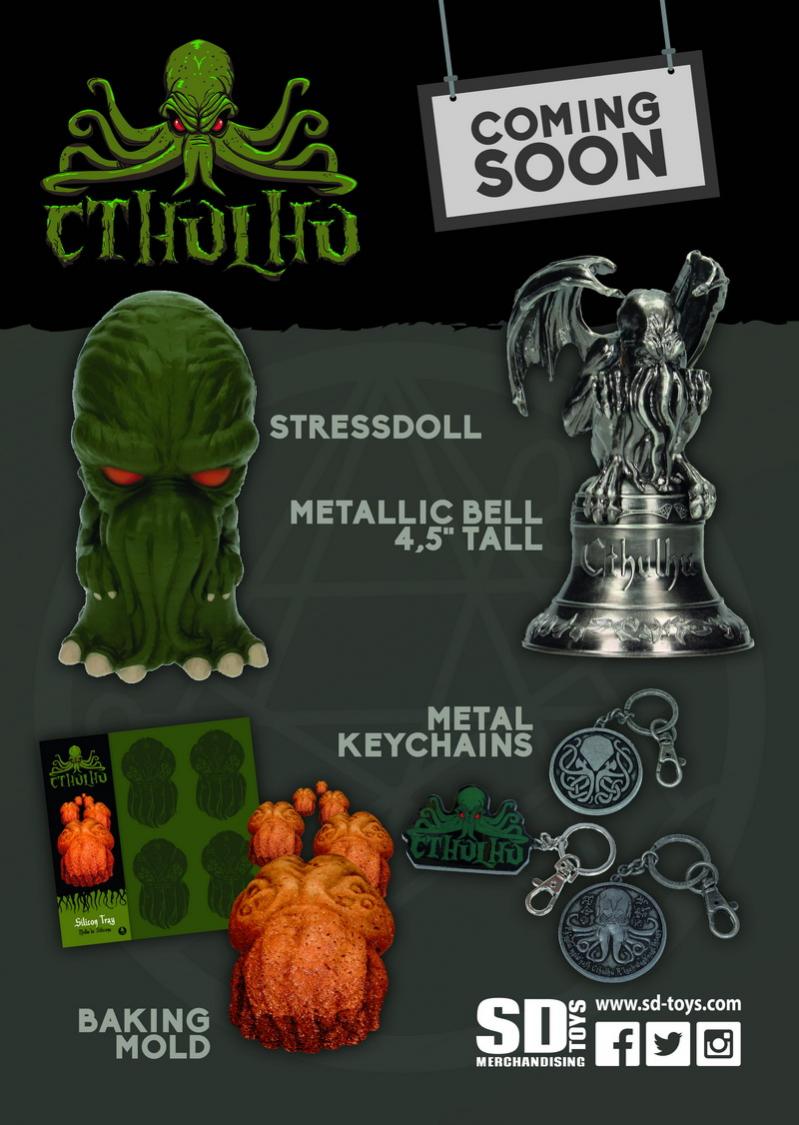 * CTHULHU - Straight outta R'lyeh! This new product line from SD Toys is focused on H.P. Lovecraft's magnificent creature creation, Cthulhu. The alien from space who we, as you should, worship every day, is coming to SD Toys in several shapes and forms. Look for Cthulhu as a stress doll, action figure, keychains, t-shirts and even a bell. Make it sound... if you dare!