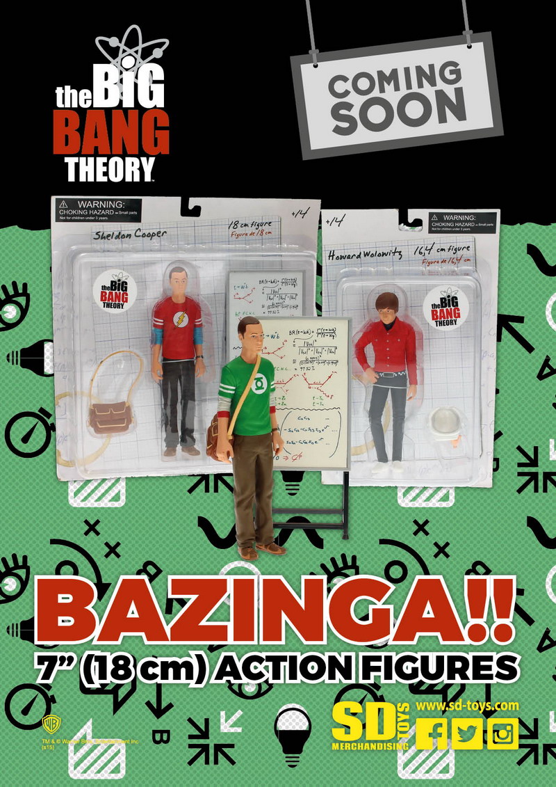 * THE BIG BANG THEORY - Sheldon and Howard 7-inch scale collectible figures. At last coming to the US after selling only in Europe, the first figures from the WB hit show are coming to your house. The 7 inch Sheldon Cooper figure showcases him with his Green Lantern T-shirt. Includes a messenger bag that can be draped over his shoulder, and as a cool added bonus, his whiteboard featuring a complex formula on... the decay of the top quark in electroweak theory and physics beyond the Standard Model! Howard brings his own sense of style with his eclectic clothing (look at that New Wave belt) and the option to switch-out his left hand with one holding a space helmet! The figures will be available in the US in january 2016. Read our advanced figure review HERE!