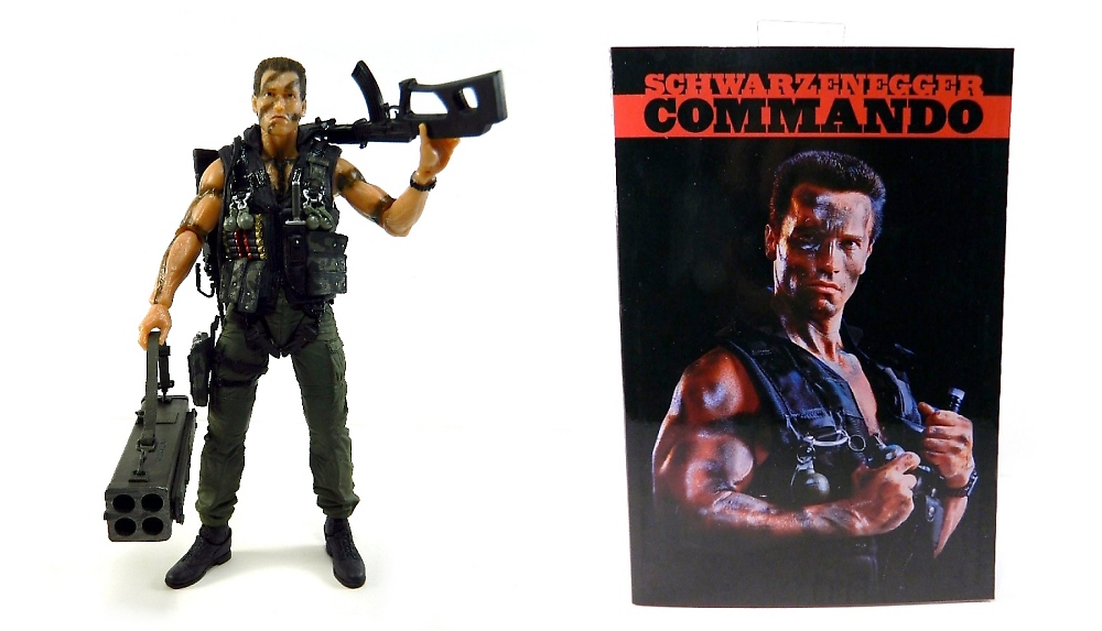 NECA's latest "Ultimate" 7-inch scale action figure has hit retail: Arnold Schwarzenegger as John Matrix from 1985's shoot 'em up Commando. Where previous NECA Ultimate releases have seen great past figures re-released with tons of gear and accessories (T-800, Freddy and Leatherface), Commando is an all-new license and the first time collectors have been treated to this character. Making Commando an Ultimate figure was a smart move. While NECA could have turned this into a full series (John Matrix with missile launcher, John Matrix shirtless with shotgun, etc. etc), Commando isn't quite the same caliber movie as say, Predator or Terminator. In other words, doing a full Commando figure line would have been risky. As an Ultimate release, NECA is able to get this cool classic out as a one-off - fully locked and loaded.