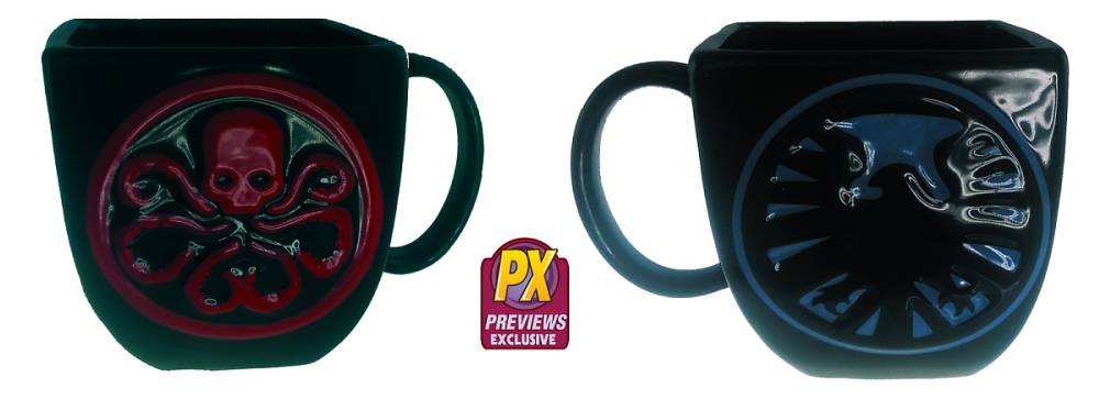 Fans can declare their allegiance to S.H.I.E.L.D. or Hydra with a molded mug featuring the logos of both organizations. The square mug has the iconic Hydra red skull with tentacles carved onto one side and the S.H.I.E.L.D eagle logo on the other! The mug can be ordered for $14.99 using item code NOV152779.