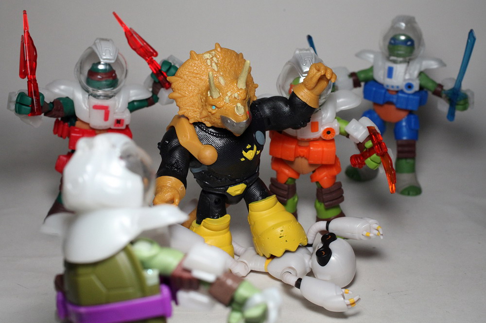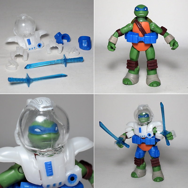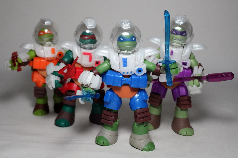 The space armor consists of helmet, leg guards, arm guards, and fist claws. Everything snaps into place and does a decent job staying on, but are prone to fall off with heavy play. Each turtle also has a space version of their signature weapon in a translucent plastic.