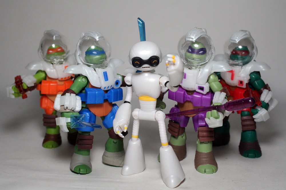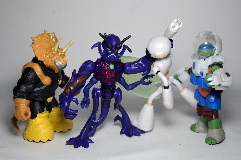 The sculpting on the figures are all fun and match the cartoon well enough, but due to the nature of their space suits, the turtles suffer a bit from small heads, but it's not terribly noticeable. Each of the turtles have unique head sculpts reflective of their personalities. The base turtles appear to be the Battle Shell Turtles, with an opening storage shell.