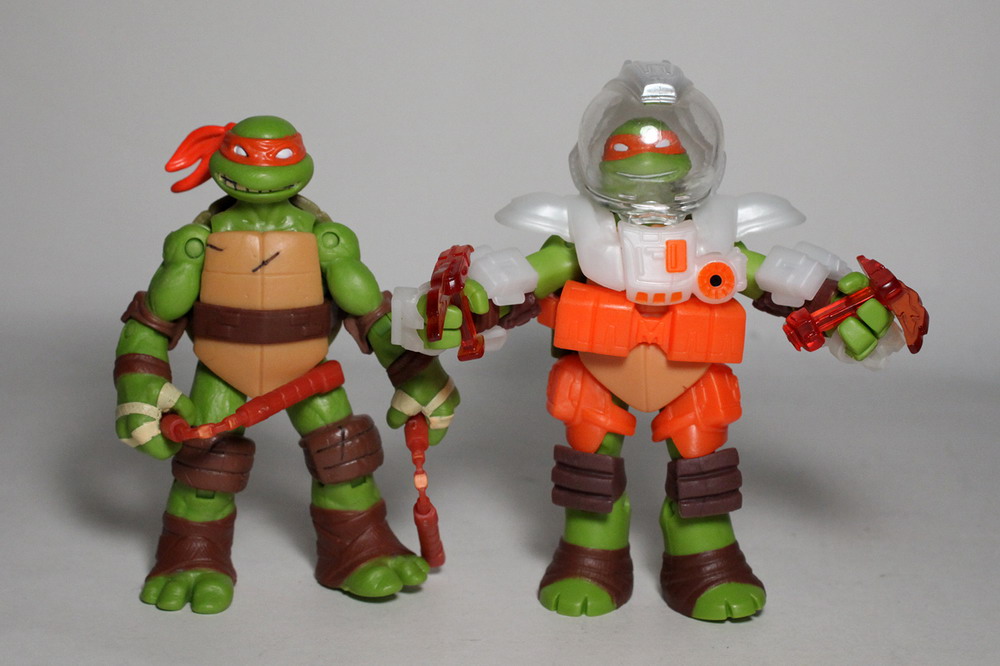 Articulation wise, these turtles have a pretty decent amount for a figure in the $9 range. Of course you get the neck, ball joint shoulders, elbows, wrist, legs, and knees. Articulation with the space gear on is more limited of course.