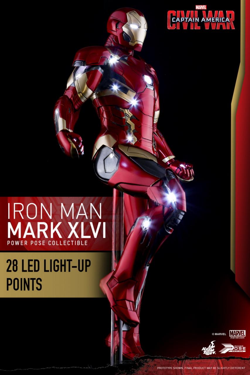 The Mark XLVI Power Pose Collectible is highly detailed and specially crafted based on the image of Iron Man’s new armor in the film featuring a meticulously sculpted sleek and streamline armor, 28 LED light-up points throughout the body, specially applied metallic red, gold and dark silver colored painting on armor, articulated head and arms, interchangeable fists and repulsor palms, and figure base.