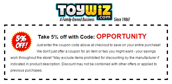 ToyWiz.com has thousands of in-stock items. Use the coupon code OPPORTUNITY and receive 5% off your purchase! Also take advantage of ToyWiz's Big Winter Blowout Sale: Up to 50% off 2015 Toys and Collectibles!