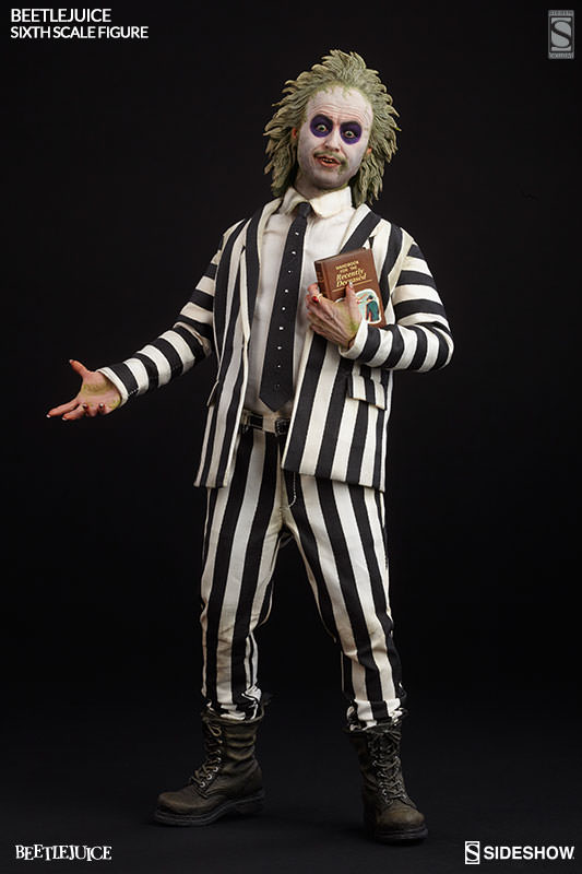 Sideshow presents the ghost with the most, Beetlejuice, as a new 1:6th scale collectible figure. The star of Tim Burton's classic 1988 movie of the same name, Beetlejuice, brilliantly played by Michael Keaton, comes dressed to impress in his black and white striped suit. Crafted on a fully-articulated poseable body, the fast-talking ghoul comes with a variety of swap-out hands and accessories. Those who order the Sideshow Exclusive Edition will also get their hands on a bonus accessory, The Handbook for the Recently Deceased.