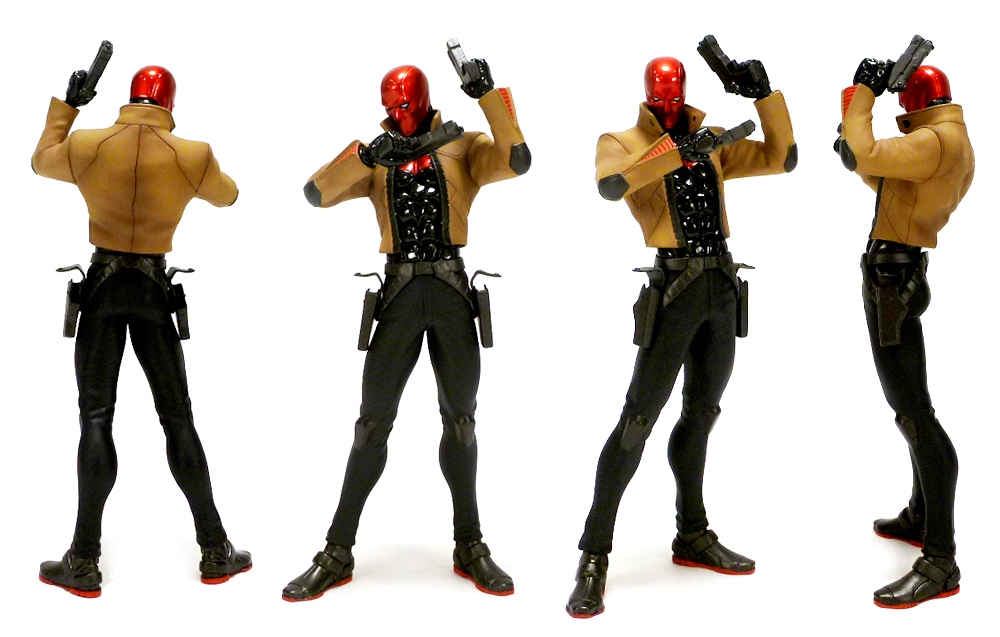 Red Hood’s sculpt (by Naoya Muto) is pretty great and deserves an up close look. Just like in the comics the anti-hero wears a variety of materials in his clothing, and those are replicated with appropriately different details. There are nice creases in his pants and jacket, along with seams, zippers, buttons, and the like. There are even armored kneepads protruding from the slacks! Jason wears heavy-duty combat shoes with thick soles, and over his pants are twin, empty holsters with the flaps unattached. Visible underneath the jacket is Red Hood’s armored breastplate, sculpted with deeply cut muscle details. His overall helmet is mostly smooth with twin lines running over the top and a fearsome face depicting only eyes and a nose. Red Hood’s pistols are nicely detailed as well.