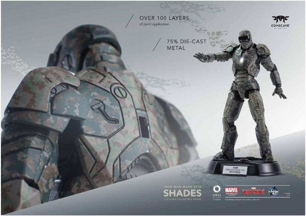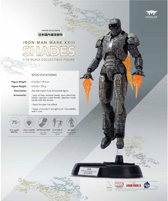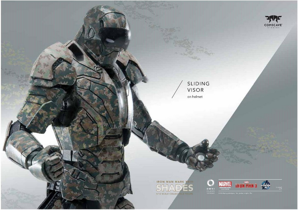 Following the release of their 1/12 scale Iron Man "Shotgun" (read our review HERE) and "Igor" (HERE), Comicave Studios presents "Shades". An Extreme Heat Suit, the 6-inch tall Mark XXIII (23) action figure will feature 75% die-cast metal construction, extreme articulation, light-up eyes and chest, and a multitude of accessories, including: