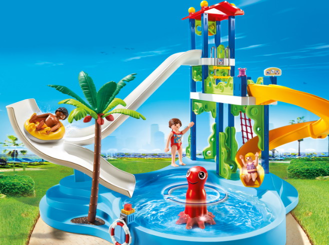 Take a break from the summer heat with a visit to the Water Park with Slides. With two jumbo slides, one regular and one for tubing, kids can slip and slide their way down to the wave pool at the bottom. The octopus in the middle spins, creating fun ripples throughout the pool. When ready to take a ride down the slide, use the park’s pulley to pull the tube up to the top of the slide. Just be sure to wait until the pink octopus gives you a green smile for heading down the slide. Set includes two adult figure, one child figure, multi-level structure with slides, tube, life ring, and lots of other accessories. Dimensions: 21.7 x 15.7 x 15.7 in (LxWxH).