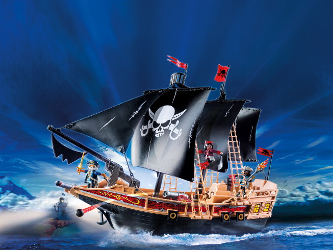 Set sail for swashbuckling adventures with the Pirate Raiders’ Ship. The fastest ship on the high seas, this floating ship features three main sails and can outrun pursuing soldier patrols. The functioning cannon help ward off anyone who tries to board and protects the valuable pirate booty, which can be hidden in the ship’s storage compartment on the main deck. Once kids reach their destination, they can drop anchor to secure their location. Set includes three pirate figures, ship, functioning cannon with four projectiles, torch, barrels, flags, swords, monkey, and lots of other accessories. Don’t want to wait for bath time to play with this ship? Just snap the included wheels into the base to allow it to roll on hard surfaces, ensuring that kids can enjoy pirate adventures any time. Upgrade this set with the RC Underwater Motor (5536 – sold separately) to remotely guide the ship through water. Dimensions: 26.4 x 9.4 x 20.5 in (LxWxH).