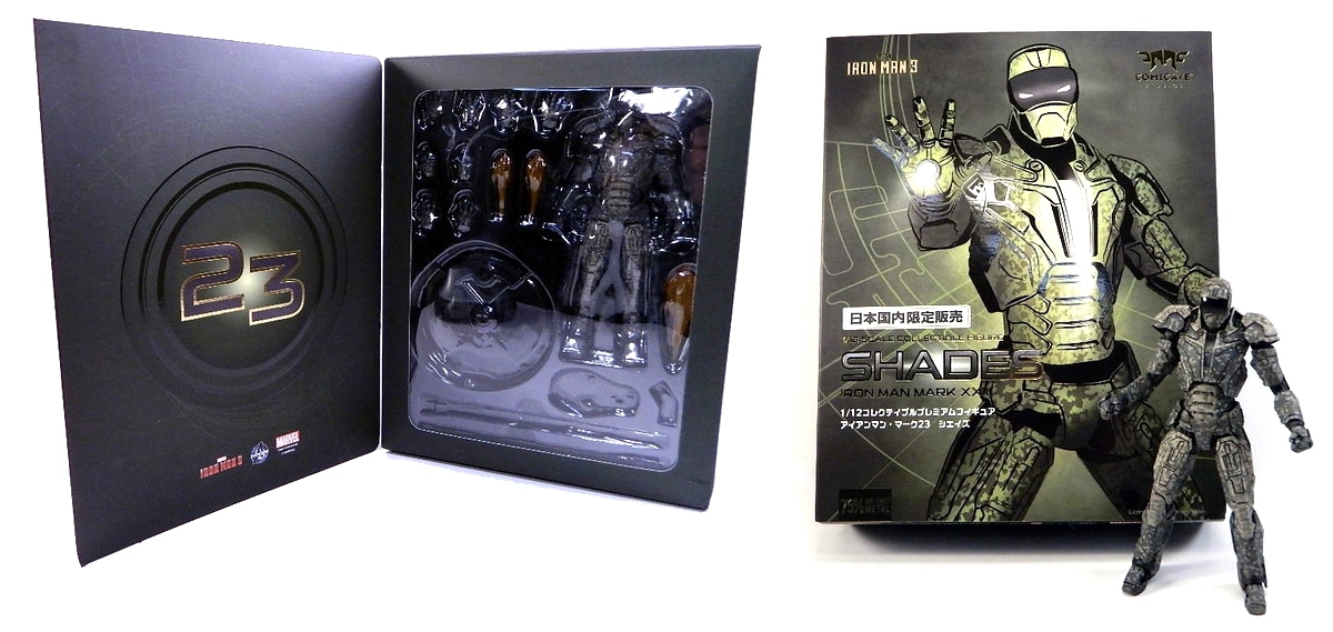 Comicave Studios follows the release of their 1/12 scale Iron Man "Shotgun" (read our review HERE) and "Igor" (HERE), with Shades". An Extreme Heat Suit, the 6-inch tall Mark XXIII (23) action figure is the latest in Comicave's series of premium Iron Man 3 armors featuring 75% die-cast metal. High-quality construction aside, it's particularly nice that Comicave is rolling out House Party Protocol suits that have never been seen before on this collectible scale. Heck, I believe this is the first figure of Shades to ever hit the market. Pricing and a U.S. release date hasn't been announced yet for Shades (the figure was just revealed a few days ago), but he should be distributed via Bluefin and he should retail for around $140, similar to Shotgun.