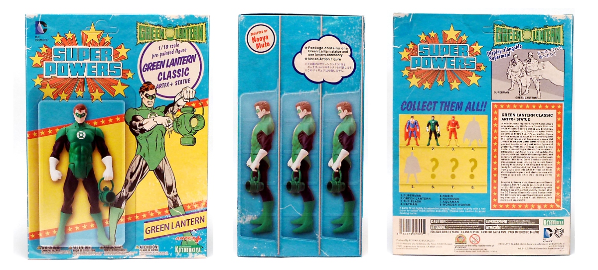As we first saw in the Superman review, anyone who knows toys from the 80s is going to recognize the massive amount of Super Powers references on the packaging for these Classic Costume statues. Of course these statues come in substantially bigger boxes rather than on cards, but Kotobukiya included all of the same colors and graphics from the originals to hit that high nostalgia note. The front panel of the package looks like an action figure blister on card with the statue in a bubble, Green Lantern artwork, logos for Super Powers, DC Comics, Green Lantern, and more, and even an “unpunched hook” at the very top. The sides of the box appear to be the interior of a case of Super Powers action figures packed in a row, while the back panel has a ton of material including a “Collect Them All!” section, a description of Green Lantern and the statue, and more. I got an unexpected bonus when I began to open the box; there’s a small Green Lantern symbol hidden on the lip of the top flap that’s only revealed when you lift it!